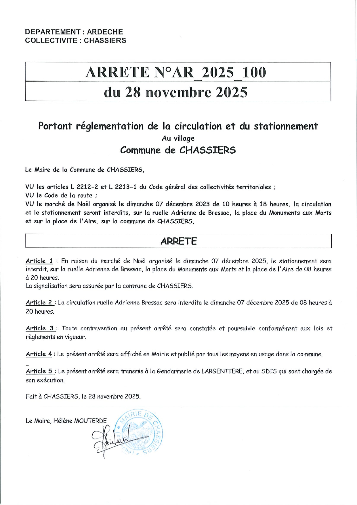 En raison du marché de Noël ce dimanche 7/12, le stationnement et la circulation place de l’ Aire, Ruelle A.Bressac et la place du monument aux Morts est interdite.