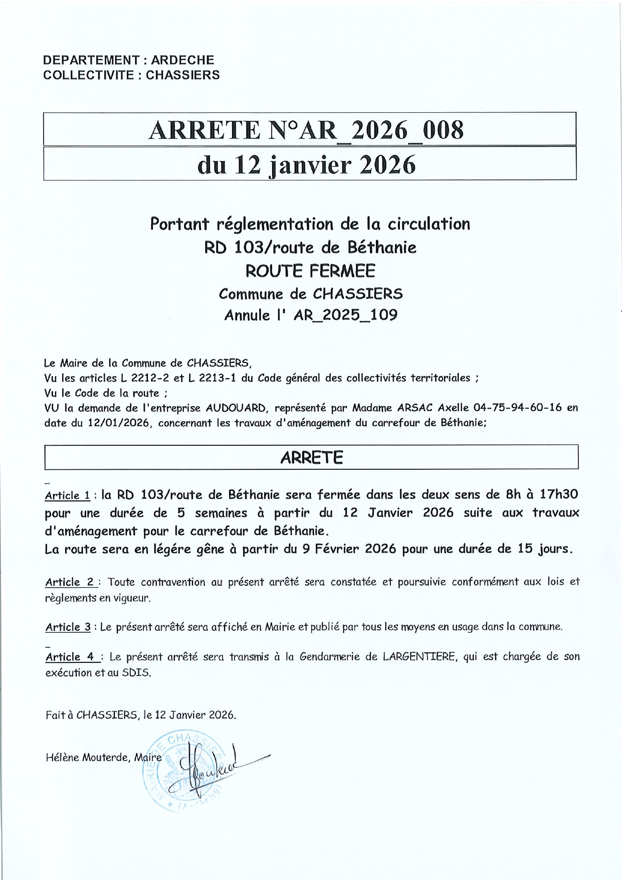 A partir du 5/01/2026 la route de Béthanie sera fermée de 8h à 17h30 pour 5 semaines