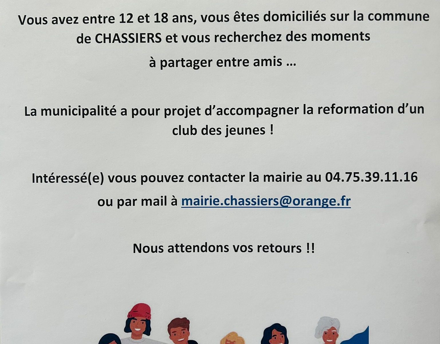 Contactez-nous au 04.75.39.11.16 ou sur mairie.chassiers@orange.fr