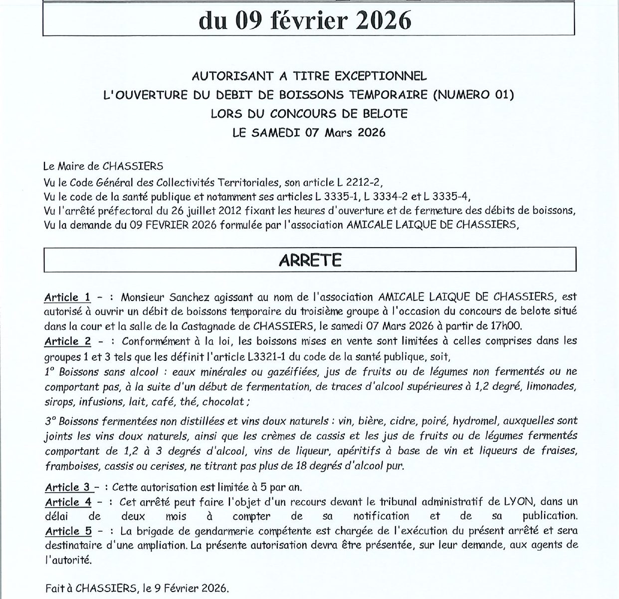 En raison de la transmission du match de rugby à la salle de la Castagnade et du concours de belote à la salle des fêtes samedi 7 Mars 2026, un arrêté de débit de boisson est accordé.